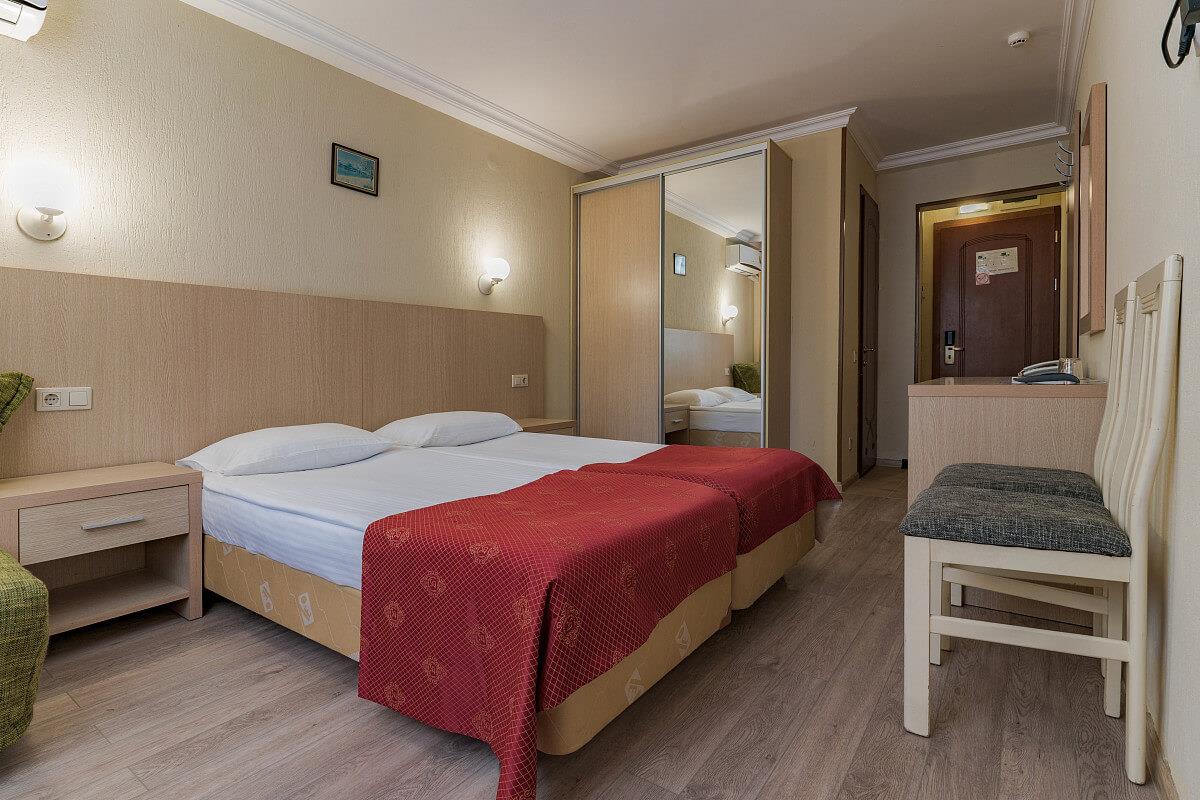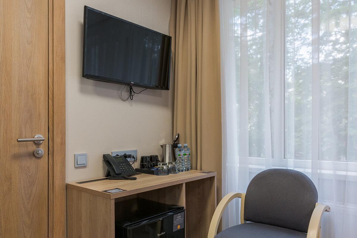Удобства в номерах: Сейф, Кондиционер, Фен, Телевизор, Холодильник, Телефон, Душ