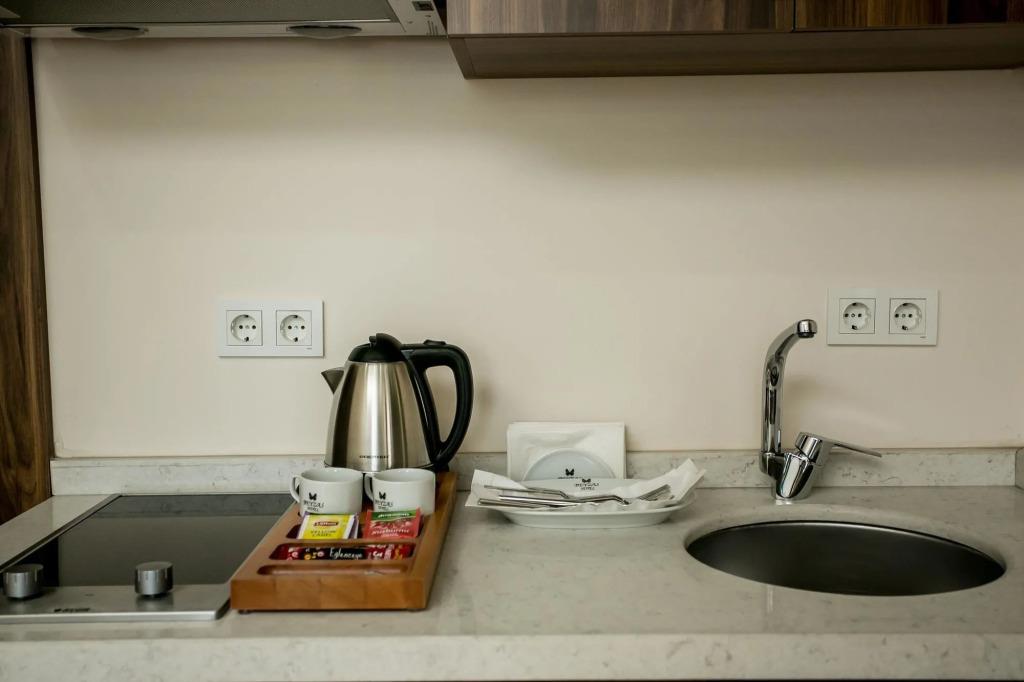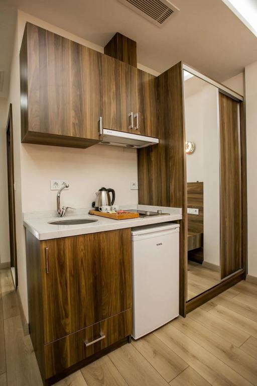 Удобства в номерах: Сейф, Кондиционер, Обслуживание в номерах, Телевизор, Холодильник, Телефон, Душ, Кухня